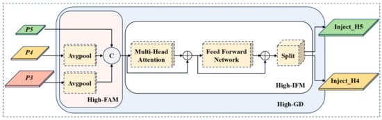 The features generated by Low-GD are processed in High-GD, as shown in Figure 6. In keeping with Low-GD, High-FAM is first used to align the size of features with the smallest size using Avgpool. The expression is as follows: