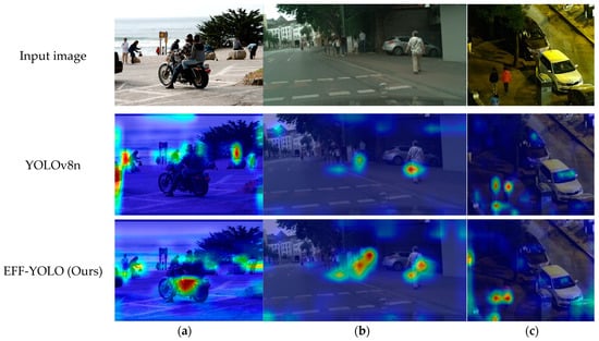 Comparison of visualized heatmaps from the EFF-YOLO and baseline on three datasets. (a) COCO-person; (b) Citypersons; (c) LLVIP.