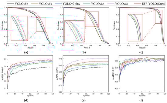 PR curves and mAP0.5:0.95 iteration curves of different models. (a) PR curve on COCO-person; (b) PR curve on Citypersons; (c) PR curve on LLVIP; (d) iterative curve of mAP0.5:0.95 on COCO-person; (e) iterative curve of mAP0.5:0.95 on Citypersons; (f) iterative curve of mAP0.5:0.95 on LLVIP.