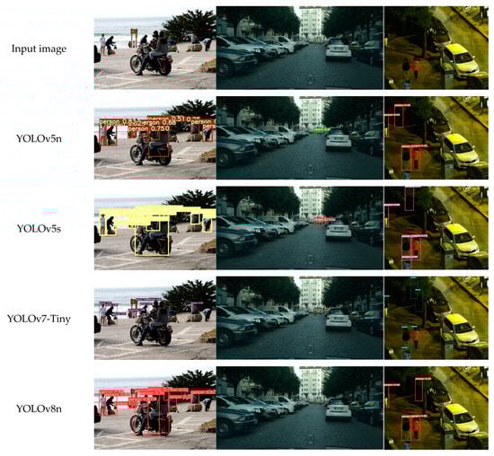 In order to validate the reliability and usefulness of EFF-YOLO for small-scale pedestrian detection, we conducted comparative experiments using five lightweight variants of the YOLO family, including YOLOv5n [23], YOLOv5s [23], YOLOv7-tiny [25], YOLOv8s [26], and YOLOv8n [26]. This evaluation aims to highlight the advantages of EFF-YOLO over these lightweight models in resource-constrained environments and real-time applications. Here, n denotes the smallest model variant nano, tiny denotes the smaller model variant, and s denotes the relatively larger but still lightweight model variant small. The experimental results are shown in Table 3. EFF-YOLO achieved 72.5% (2%↑), 72.3% (1.3%↑), and 91.0% (0.6%↑) mAP0.5 on the three benchmark datasets, respectively. Specifically, on the COCO-person dataset, YOLOv7-tiny achieved the highest mAP0.5, YOLOv8s achieved the highest mAP0.5:0.95 and precision, and EFF-YOLO achieved the highest recall value. On the Citypersons dataset, YOLOv8s reaches the highest mAP0.5 and mAP0.5:0.95, while EFF-YOLO achieves the highest precision. Furthermore, on the pedestrian-detection dataset LLVIP in low light, the mAP0.5, mAP0.5:0.95, and precision of EFF-YOLO are only 0.2%, 0.2%, and 1.4% lower than the highest metrics, which demonstrates a near-optimal level of performance in low-light conditions.