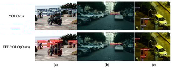 Through visual detection effects, we can intuitively evaluate the performance of different models in practical application scenarios, which helps to reveal the real performance of models in complex environments. The visualization of the model detection results is shown in Figure 9. Other algorithms generally suffer from missed detection or false detection when facing pedestrian images with different object scales. Specifically, the detection effect of the COCO-person dataset is shown in Figure 9a. EFF-YOLO can effectively identify and accurately locate objects for both small-scale pedestrians located far away and multiple human bodies on motorcycles. The visualization results of the Citypersons dataset are shown in Figure 9b. For small-scale pedestrians at the end of the street, only YOLOv5s and EFF-YOLO can accurately detect the pedestrians in the figure, while other algorithms cannot. Visualization results of the LLVIP dataset are shown in Figure 9c. When pedestrian-like features exist in images with weak light at night, only YOLOv8s and EFF-YOLO effectively suppressed interference information and accurately detected pedestrians. In summary, the EFF-YOLO model shows better results in pedestrian detection in low-light environment and small-scale pedestrian detection, and effectively completes the recognition task of this study.