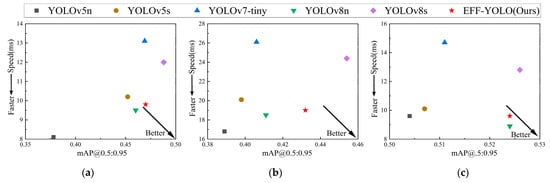 Figure 10 provides a comparative analysis of the speed–accuracy trade-off for six models across three datasets. EFF-YOLO demonstrates high accuracy and fast inference speed, indicating that the algorithm achieves faster detection while maintaining detection accuracy. This advantage makes EFF-YOLO more valuable in practical applications, especially for scenarios that require real-time processing of large amounts of data such as intelligent transportation systems and surveillance systems.