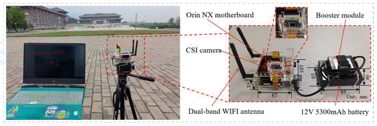 The optimized model is deployed on a Jetson Orin NX development board to test the real-time detection capability of the model. The deployment process uses TensorRT [37] to optimize the model in ONNX format and convert it to an engine file format specific to the NVIDIA platform. We also used DeepStream to build a video-analysis pipeline to simplify the complex video-processing logic. Finally, programs were written in C++ to call the converted models for real-time inference. To facilitate outdoor testing, NoMachine is used as a remote access solution to remotely control the Jetson development board over the network. The test platform and scenario are shown in Figure 11. The platform connects to a Sony IMX219 camera via a Camera Serial Interface (CSI) interface to obtain a live video stream as input data. All configurations run at 16-bit floating-point precision. The real-time detection scenarios include a school lawn and a main road, which mainly test the model’s detection ability in open areas and dynamic environments. The testing time covers both day and night to evaluate the robustness and accuracy of the model under different lighting conditions.