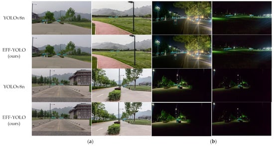 To validate EFF-YOLO in real-world application scenarios applied to the edge of equipment performance, we present the visualization results of pedestrian detection in various complex campus scenes in Figure 12. During the day, both EFF-YOLO and YOLOv8n demonstrate comparable detection performance in a variety of campus settings. Whether in open areas with clear visibility or in more cluttered environments with numerous obstacles, both models maintain high detection accuracy. However, EFF-YOLO shows a notable advantage in detecting small-scale pedestrians. For instance, in the first image, EFF-YOLO accurately detects a person riding a bicycle behind a flower bed, a scenario where YOLOv8n struggles. At night, the challenges increase due to reduced lighting and potential occlusions. Despite these conditions, EFF-YOLO continues to perform well, accurately detecting pedestrians even at a distance. This capability is particularly valuable for nighttime surveillance and safety applications, where traditional models might struggle due to poor lighting conditions. In contrast, the baseline YOLOv8n experiences more difficulties. On streets with significant exposure and tree interference, YOLOv8n produces a higher number of false negatives. Additionally, in the third row and third column image, YOLOv8n incorrectly identifies distant lights as pedestrians. These results further confirm that EFF-YOLO maintains excellent real-time detection performance while ensuring accuracy, making it a superior choice for applications such as campus security and crowd management, especially in challenging environments.