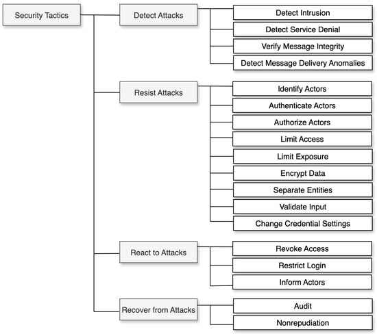 - Ryoo, J.; Laplante, P.; Kazman, R. Revising a Security Tactics Hierarchy through Decomposition, Reclassification, and Derivation. In Proceedings of the 2012 IEEE Sixth International Conference on Software Security and Reliability Companion, Gaithersburg, MD, USA, 20–22 June 2012; pp. 85–91. [Google Scholar] [CrossRef]