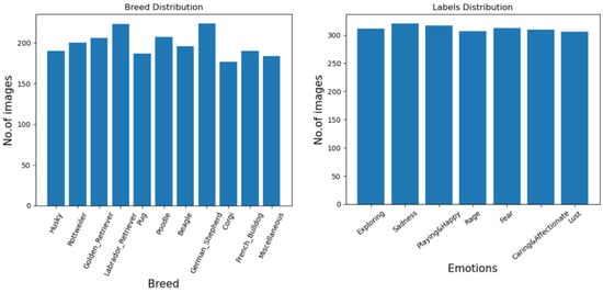 To ensure that the dataset obtained from Google Images and Wikipedia was representative and unbiased, we chose around 200 images of each breed and divided them into ten popular breeds and one miscellaneous category. To handle emotional bias, we categorized these images into seven emotions: Exploring, Sadness, Playing, Rage, Fear, Affectionate and Lust. Maintaining strict criteria for labeling each image, paying attention to facial expressions, body posture and other non-verbal cues, were factors that contributed to the consistency in their labeling. The images were taken in various environments, such as indoor, outdoor and lighting conditions that may have been more robust, and resulted in the dataset reflecting broadly diversified real-world scenarios and different breeds of canines.