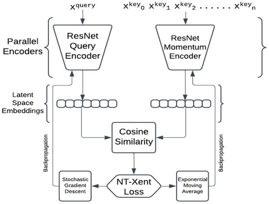 Momentum Contrast for Unsupervised Visual Representation Learning [12], also known as MoCo, is another popularly used contrastive learning framework that utilizes a technique called ‘Cross Batch Memory Accessing’ [28] to get around the issue of requiring a large batch size. The MoCo framework involves the implementation of a queue to store the features generated by past batches, and uses them as negative samples during training. The MoCo frameworks uses two encoders unlike SimCLR, which uses a single encoder interchangeably. The two encoders are called ‘Query Encoder’ denoted by ‘encQ’, and ‘Momentum Encoder’ denoted by ‘encK’. The query encoder is updated using a stochastic gradient descent, while the momentum encoder is updated using an exponential moving average.