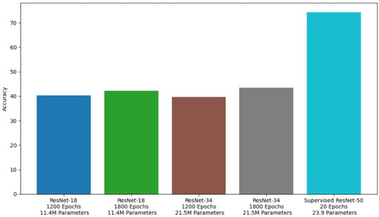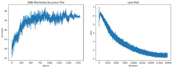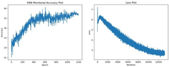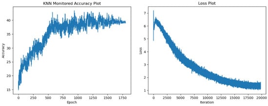 The feature vectors produced by the encoder were tested for accuracy using the KNN classifier borrowed from [36]. The value for the ‘K’ nearest neighbors to be considered in the embedded space was set to 200. The classifier used the cosine similarity as the distance metric for the feature vectors. The implementation of this was taken from the GitHub Repositories http://github.com/zhirongw/lemniscate.pytorch (accessed on 21 March 2024) and https://github.com/leftthomas/SimCLR (accessed on 21 March 2024). The learning rate scheduler was a cosine annealing scheduler with the value for temperature set to 0.1, since it performed best with this InstDisc KNN monitor [36].