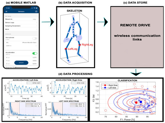 Principle of data processing during rehabilitation exercises presenting (a) mobile Matlab initialization, (b) data acquisition using accelerometric sensors inside the smartphone, (c) export of recorded signals to the remote drive, and (d) processing of data on the remote drive in time and frequency domains to extract motion features and evaluate the coefficient of symmetry.