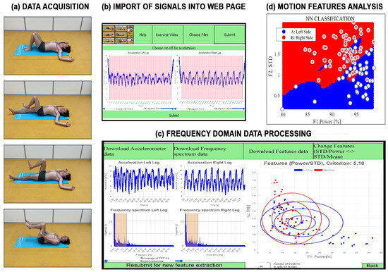 Principle of data processing during rehabilitation exercises presenting (a) animation of motion exercises to train individuals and data acquisition using a smartphone, (b) data import into the proposed web-page, (c) frequency domain remote signal processing including symmetry coefficient estimation, and (d) extraction and analysis of motion features.