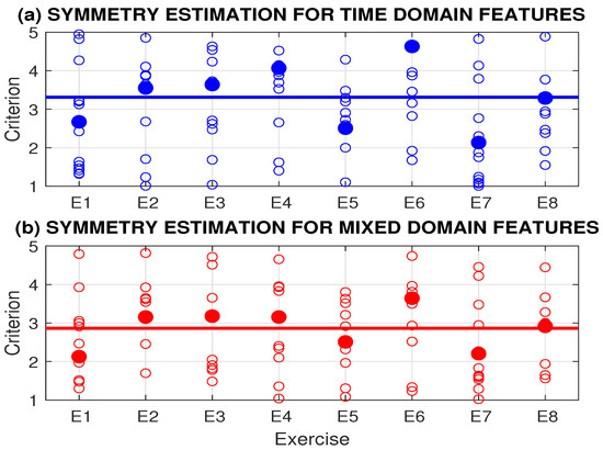 Symmetry criteria for 8 rehabilitation exercises evaluated by (a) time domain and (b) mixed-domain features presenting mean values by 16 tests of different individuals with 10 repetitions of each rehabilitation exercise.