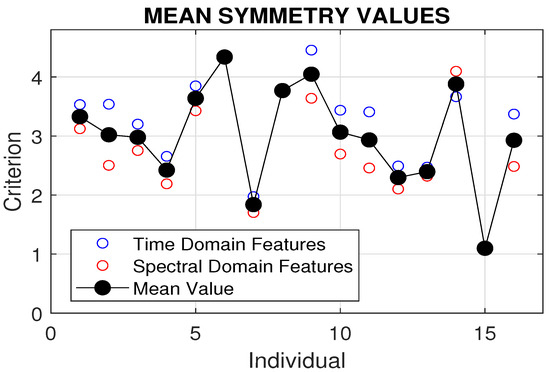 More detailed results are presented in Table 3 for the set of individuals under study. A comparison of symmetry criteria for 16 tests involving different individuals and 8 rehabilitation exercises, evaluated using time domain and spectral domain features, is shown in Figure 5. The best symmetry was observed for individual 15, with a mean symmetry coefficient of 1.1 across all rehabilitation exercises.