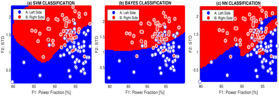 Figure 7 presents the classification of the symmetry features for cross-motion (exercise 6) using mixed features and three different methods: support vector machine, the Bayesian method [51,52], and a two-layer neural network (NN) with 10 neurons in the first layer and sigmoidal/softmax transfer functions in the first and second layers, respectively.