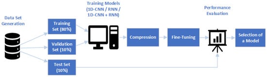 Compression techniques serve to limit the energy, processing capacity, and storage of DNNs. As noted by Mishra et al. in a systematic review on compression methods, optimisation of the model can be performed in terms of network pruning, sparse representation, bit precision, and knowledge distillation [31]. Optimisation of the model can be achieved by removing filters, connections between neurons, and less fundamental layers (network pruning) or it can be carried out by exploiting the distribution of weights in the models (sparse representation), where the weights establish the importance of connections between specific neurons. Weights that are zero or close to zero can be eliminated, lightening the number of network parameters. It is possible to reduce the accuracy of the weights by using a smaller number of bits, depending on the memory requirements of the model (bit precision). However, when quantising a model, there is a risk of reducing its accuracy. Knowledge distillation techniques therefore transfer information from a “teacher” network to a more compact “student” network, improving its accuracy.