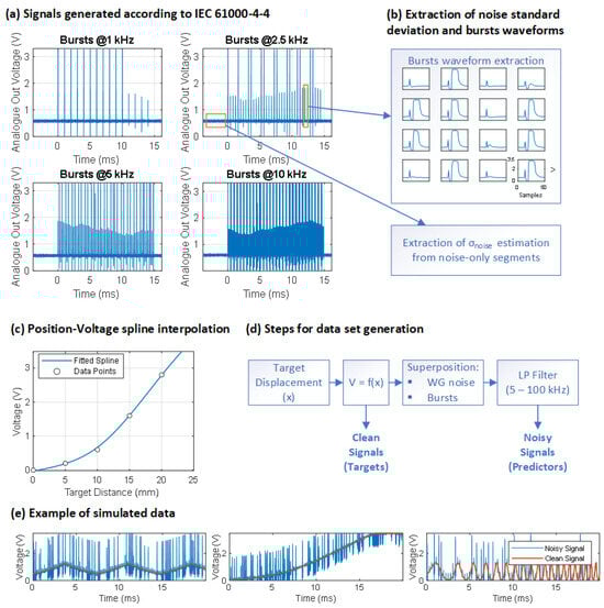 Data set production procedure. (a) Signals generated according to IEC 61000-4-4 [1], representative of the analogue voltage output to Contrinex M30 inductive sensors, disturbed in 15 ms windows by bursts at frequencies of 1 kHz, 2.5 kHz, 5 kHz, and 10 kHz, respectively. (b) Extraction of noise and burst information from real signals: to obtain an estimate of the amount of noise in the signals, the standard deviation () of the four signals in the window prior to the start of burst generation was extracted. The average value of the four signals was taken as a reference value for the simulated signals. The waveforms of the bursts were extracted by moving a window on the signals. (c) The voltage (V) as a function of the displacement of the target (x) was calculated according to the response diagram provided by the data sheet of M30 inductive sensor [23]. (d) The diagram describes the procedure used for the simulation of new signals. A signal indicative of x was generated. V was calculated as f(x), where f was found in (c). AWGN was added to the clean signal with a of ±50% of the reference value found in (b). Bursts were added to the signal with a random frequency between 1 and 10 kHz. The signals were finally low-pass filtered at a random frequency between 5 and 100 kHz to simulate more real-world situations where disturbances are more attenuated. The signal thus obtained was the noisy signal. (e) Examples of simulated signals, representing, respectively, a target moving forward and backward relative to the sensor, an object moving away, and harmonic motion with an increase in frequency.