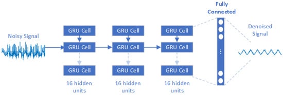 Unlike other DNNs that treat inputs as separate entities, RNNs consider the temporal order of inputs making them suitable for the analysis of temporal sequences [27]. Also, for RNNs, the input signals do not need to be pre-processed, but are directly acquired on the input layer in the time domain, since this type of network is ideal for time series prediction and sequence generation tasks. The most frequently used recurrent layers are the LSTM and GRU layers. LSTM layers use gated units to control the flow of information through the network. They contain three gates: input, output, and forget gates. The gate mechanisms are part of the hidden units, i.e., memory cells that determine the complexity of the model. The number of hidden units therefore determines the size and granularity of the model representation: more units allow the model to store and process more information, also increasing the size of the network. The input gate controls the information in the memory cell, the forget gate controls the information leaving the system, and the output gate controls the process of translating the information into output [20]. A simplified version of LSTM is GRU. It consists of only two gates: the update gate which controls the information entering the memory and the reset gate which controls the information leaving the memory [20]. To decide which approach was most appropriate for the problem at hand, tuning was also carried out by choosing whether to use an LSTM or GRU layer. The result of the tuning reported that the GRU layer performed best. The final model, therefore, has one input layer, followed by three GRU layers, each with 16 hidden units. The architecture ends with a Fully Connected layer that is responsible for the final prediction (Figure 4).