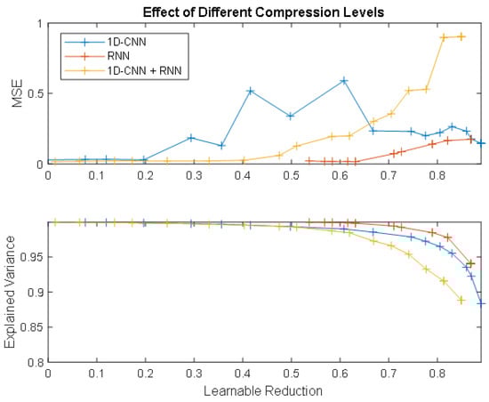As fewer and fewer learning parameters are taken into account in the projected models, the explained variance (i.e., the amount of variance regarding the initial total variance that is to be retained [30]) decreases and, along with it, the model error increases (Figure 6). This shows how compressing a model generally results in a degradation of its performance. Consequently, to improve the models, the projected networks were fine-tuned, i.e., the pre-trained projected models were used as a starting point for further training. Generally, a lower learning rate is used to make the process more stable and the training is conducted for fewer epochs. We fine-tuned for 40 epochs, using the Adam optimiser, and reducing the learning rate at for the 1D-CNN and the hybrid approaches, and at for the RNN approach.