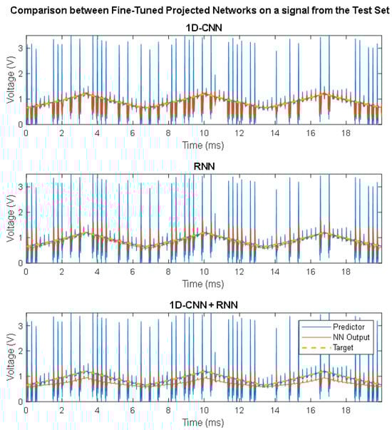 Smaller MSE values and bigger MSEred and SNRimp values show that the RNN model, followed by the hybrid model, achieved the best results in terms of denoising capabilities. The tolerance represents the percentage of signals in the test set which pass the test described by the IEC 60947-5-7 [29]. This metric remains very low in all cases. Only the RNN model manages to remove most of the bursts to such an extent that 24 out of 100 signals fall below the measured threshold. For the hybrid model, the tolerance is lower (10%) and for the 1D-CNN model it is zero. In the latter case, the worst denoising performances are also observed. In this case, the highest value of MSE and the lowest values of MSEred and SNRimp are reflected in an inability of the network to bring the denoised signals below the imposed threshold. In this sense, the tolerance offers a more severe and restrictive analysis than the MSE and SNR, as the threshold of variation from the ideal signal set is very low.