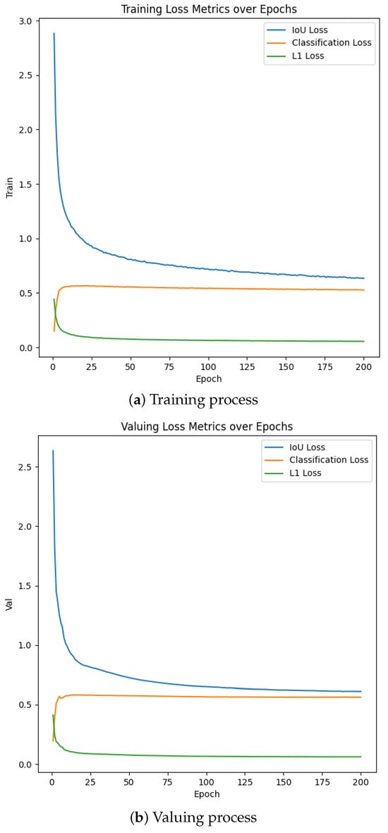 The variation curves of IoU loss, classification loss, and L1 loss during the training process of the improved model are shown in Figure 6. On both the training and validation sets, the IoU loss shows a rapid decreasing trend and tends to stabilize after the initial 25 training cycles. This indicates that the model quickly achieved high performance in spatial positioning accuracy and made relatively accurate predictions for bounding boxes. The decreasing trend of classification loss on the training and validation sets is relatively gentle, indicating that the classification task was more complex. Nevertheless, the loss gradually stabilizes after sufficient training epochs, indicating that the model gradually adapted to learning to distinguish between different categories of targets. The L1 loss shows a continuous decreasing trend on both the training and validation sets, reflecting the model’s continuous improvement in finely adjusting the predicted position. The stable decrease in L1 loss also indicates that the model’s ability to handle position errors gradually increased. In the end, all three types of losses tended to stabilize, indicating that the improved model proposed in this paper is effective and has a good learning effect. Overall, the loss curves on the training and validation sets show a consistent trend, indicating that the model did not experience overfitting. The performance of the model on the validation set was similar to that on the training set, indicating its good generalization ability.