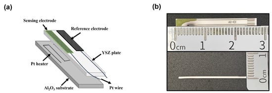 (a) Schematic illustration of the planar YSZ-based gas sensor; (b) the fabricated miniaturized YSZ-based sensor.