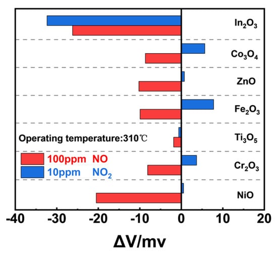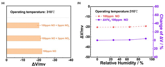 To further justify the NiO-SE sensor’s ability to differentiate NO in a mixture, Figure 5a compared the responses of the sensor to 100 ppm NO interfered with different concentrations of NO2. It could be concluded that the response to 100 ppm NO changed little and the NiO-SE sensor showed excellent anti-interference capability. In addition, the sensor may work under relatively high humidity environments in real practical applications, and Figure 5b illustrates the responses and the change in response values of the NiO-SE sensor at 0%, 24%, 67%, and 91% RH separately to 100 ppm NO at 310 °C. The maximum |ΔV| value was 5% under the range of 0–91% RH, proving that the sensor displays good humidity resistance.