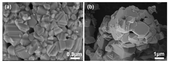 Furthermore, micro-structures of NiFe2O4, Fe2O3, and their composite (e.g., NiFe2O4 + 30 wt.% Fe2O3) were characterized via scanning electron microscope (SEM) and presented in Figure 7. In comparison with NiFe2O4 (Figure 7a,b) and Fe2O3 (Figure 7c,d), a certain amount of grains (with a diameter of around 0.6 μm), which could be assigned to NiFe2O4, was observed in the NiFe2O4 + 30 wt.% Fe2O3 composite. Moreover, it is reasonable to deduce that the formed composite had a more porous and three-dimensional (3D) structure when compared with that of NiFe2O4. The porous 3D micro-structure would offer more active reaction sites for NO2.