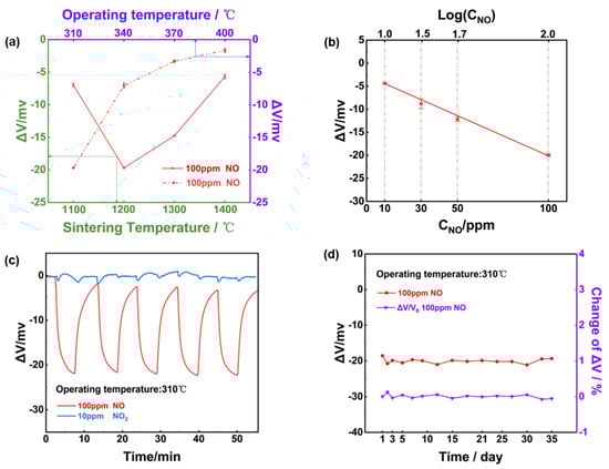 To confirm the practicability of using NiO tracking a high level of NO with high selectivity against 10 ppm NO2, sensing characteristics of the YSZ−based gas sensor comprised of NiO-SE vs. Mn−-based RE were studied. Figure 4a depicts the relationship between the sensor’s response and the operating/calcination temperature for the NiO−SE; it can be confirmed that the optimal response signal was observed for the sensor fabricated at 1200 °C. Moreover, it should be noted the operated temperature of YSZ solid electrolyte must be above 300 °C [32]. And it needs to be clarified that when the operating temperature was below 300 °C, the conductivity of YSZ was greatly reduced, which led to poor recovery characteristics and noticeable noise in the sensor’s response curves. Consequently, the optimal operating/calcination temperature was selected at 310 °C and 1200 °C for the following study. As shown in Figure 4b, the response signal of the sensor varied linearly to the logarithm of the NO concentration in the range of 10–100 ppm. According to the repeated response transients of the sensor that were exposed to 100 ppm NO and 10 ppm NO2 (Figure 4c), it can be concluded that the sensor gave excellent repeatability in the successive runs and high selectivity to 100 ppm NO (24.7 mV) against 10 ppm NO2 (less than 1 mV). In light of the long-term stability, which is a crucial factor in practical applications. A 35-day test to 100 ppm NO was further measured under 310 °C, as shown in Figure 4d, variation in the response value during the tested period was roughly estimated to be less than 3 mV, indicating satisfactory stability of the sensor using NiO-SE and Mn−based RE.