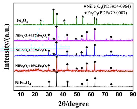 Figure 6 demonstrated the XRD patterns for NiFe2O4, Fe2O3, and (NiFe2O4 + x wt.% Fe2O3) composites after calcined at 1200 °C for 2 h. No impurity peaks were observed, confirming the high purity of the products. However, there were no characteristic diffraction peaks of Fe2O3 for the composite materials; the reason for this could be Fe2O3’s lower loading content and weak crystallization.