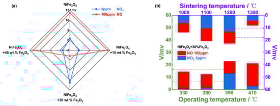 Accordingly, sensing behavior to detect 3 ppm NO2 and 100 ppm NO for the YSZ−based gas sensor utilizing NiFe2O4 and its composite-SEs (vs. Mn-based RE) was examined. As shown in Figure 8a, when the amount of Fe2O3 reaches 30%, the sensor gave superior selectivity and sensitivity to 3 ppm NO2 against 100 ppm NO. In other words, the YSZ−based gas sensor using (NiFe2O4 + 30 wt.% Fe2O3)-SE is a good candidate for tracking the trace amount of NO2. Figure 8b suggests the optimal operating/calcination temperature was 390 °C/1200 °C.