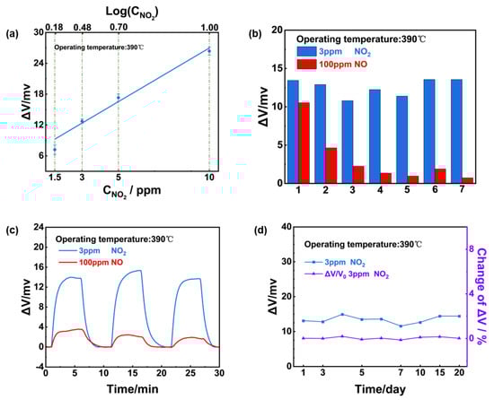 The dependence of the sensing response on the NO2 concentration in the range of 1.5–10 ppm was examined and a linear relationship between response value and NO2 concentration on a logarithmic scale (Figure 9a). Notably, it can be concluded that after aging for several days (2–3 days), the response signal of the sensor to 100 ppm NO significantly decreased, whereas it maintained a high response value of 3 ppm NO2 (Figure 9b). This phenomenon might be caused by the sensing materials’ gas phase catalytic reaction to NO, whereby a certain amount of NO was converted to NO2 before arriving at the TPB, and both NO and NO2 triggered the electrochemical reaction in reality. Based on the aforementioned Reaction (1)–(4), the measured potential signal was the final response after the response of NO offset the response of NO2. However, in early tests, the mixed materials’ properties were not yet stable, and the conversion efficiency of NO was dynamic. After several days of aging, the NO conversion rate stabilized and the sensor’s response to NO was maintained. Figure 9c,d further indicates the sensor’s excellent repeatability and stability as well as ultra-high selectivity to 3 ppm NO2.