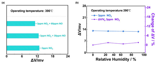 The selectivity to NO2 of (NiFe2O4 + 30 wt.% Fe2O3)-SE could be reinforced in Figure 10a. The responses of the sensor only reduced less than 4 mv even when 3 ppm NO2 was mixed with 90 ppm NO and it could be concluded that the (NiFe2O4 + 30 wt.% Fe2O3)-SE sensor showed excellent selectivity to NO2 at 390 °C. The sensing performance of the (NiFe2O4 + 30 wt.% Fe2O3)-SE sensor on the variation in the water vapor content (0–91% RH) was also studied, and Figure 10b shows that the sensor’s response values to 3 ppm NO2 were hardly affected by the change in humidity, which could be ascribed to the desorption of water at such a high operating temperature.