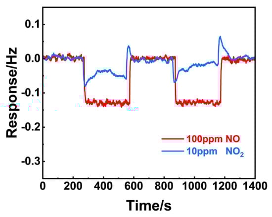 According to the working principle of an electrochemical gas sensor, the target gas initially selectively adsorbs on the surface of the sensing material and then participates in the following electrochemical reaction. In this case, both adsorption capabilities and electrochemical reactivity contribute to the final response selectivity and response value. To understand which step primarily determines the widely concerned selectivity during NOx sensing, we initially used microgravimetric technology [38,39] to compare the NOx adsorption capabilities of each sensing material. In this study, changes in the microcantilever’s vibration frequency directly reflected the difference in the adsorption capabilities of NO and NO2.