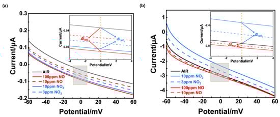 Polarization curves in different concentrations of NO and NO2 using different sensors: (a) sensor using NiO−SE, operated at 310 °C; (b) sensor using (NiFe2O4 + 30 wt.%Fe2O3)−SE, operated at 390 °C (ΔINO and ΔINO2 represent the current value generated from NO or NO2, respectively).