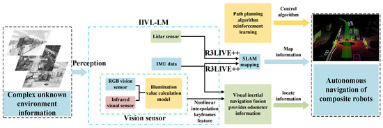 Composite robots often encounter difficulties due to changes in illumination, external disturbances, reflective surface effects, and cumulative errors. These challenges significantly hinder their capabilities in environmental perception and the accuracy and reliability of pose estimation. We propose a nonlinear optimization approach to overcome these issues to develop an integrated localization and navigation framework, IIVL-LM (IMU, Infrared, Vision, and LiDAR Fusion for Localization and Mapping). This framework achieves tightly coupled integration at the data level using inputs from an IMU (Inertial Measurement Unit), an infrared camera, an RGB (Red, Green and Blue) camera, and LiDAR. We propose a real-time luminance calculation model and verify its conversion accuracy. Additionally, we designed a fast approximation method for the nonlinear weighted fusion of features from infrared and RGB frames based on luminance values. Finally, we optimize the VIO (Visual-Inertial Odometry) module in the R3LIVE++ (Robust, Real-time, Radiance Reconstruction with LiDAR-Inertial-Visual state Estimation) framework based on the infrared camera’s capability to acquire depth information. In a controlled study, using a simulated indoor rescue scenario dataset, the IIVL-LM system demonstrated significant performance enhancements in challenging luminance conditions, particularly in low-light environments. Specifically, the average RMSE ATE (Root Mean Square Error of absolute trajectory Error) improved by 23% to 39%, with reductions from 0.006 to 0.013. At the same time, we conducted comparative experiments using the publicly available TUM-VI (Technical University of Munich Visual-Inertial Dataset) without the infrared image input. It was found that no leading results were achieved, which verifies the importance of infrared image fusion. By maintaining the active engagement of at least three sensors at all times, the IIVL-LM system significantly boosts its robustness in both unknown and expansive environments while ensuring high precision. This enhancement is particularly critical for applications in complex environments, such as indoor rescue operations.