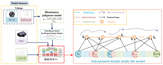 This paper refines the VIO within the R3LIVE++ fusion framework, specifically addressing the issue of feature loss in RGB cameras due to complete darkness. The VIO module is divided into two sub-modules: one for the infrared camera and one for the RGB camera. Through the Illuminance Conversion Model module, luminance is calculated in real-time to achieve effective, tight coupling between the infrared and RGB frames. The NIKFF (Non-linear Insert Keyframe Feature Fusion) module effectively segments the luminance into three non-linear stages. In the middle stage, weighted fusion is used to extract image features. Additionally, the Ceres Solver [33] method is employed to solve the non-linear optimization interpolation problems within this module. The system configuration is depicted in Figure 2.