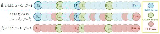 The above completes the visual refinement fusion work within the VIO module. Additionally, during loop closure detection, this paper relies on dynamic weights to optimize the interpolation values of the three sensors. Since illumination does not affect the performance of LiDAR, the interpolation ratio for LiDAR remains unchanged. However, the interpolation for RGB and infrared images changes linearly according to the variation in weights, as shown in Figure 4. Different colors represent frames from different sensors, with solid lines representing key frames for loop closure detection and dashed lines representing ordinary frame information. This variation indicates that the number of frame insertions for sensor type varies depending on the weights applied during global mapping under different illumination conditions.