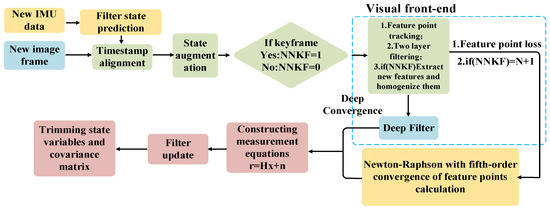 In the process of optimizing VO to handle new IMU data, the current system state is first assessed through filter state prediction. This prediction is then augmented with the new image frame after timestamp alignment to determine if new keyframe tracking is necessary. When the system identifies NNKF = 1 (Need for a New Key Frame), feature point tracking is executed to identify and track known feature points across successive image frames. This process includes a two-layer filtering approach. First, it checks for feature point loss. If feature points are lost, indicating the need to track additional points to meet system requirements, new feature points are extracted. These newly extracted feature points are homogenized to ensure uniform distribution in the image space, providing more comprehensive and accurate information. Next, as additional feature points are introduced as observations, the system calculates the observed count as N + 1 and enters the depth convergence phase. We use a deep filter to process and update each feature point’s depth information, leveraging multi-frame data for more accurate depth estimation.
