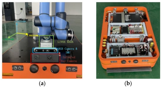 The experimental hardware platform discussed in this paper is a multifunctional composite robot, which includes an AGV (Automated Guided Vehicle) route chassis, a Duco brand collaborative robotic arm, and an integrated mapping and positioning system. The software is based on the ROS (Robot Operating System) platform, with chassis control managed by an embedded processor and control commands transmitted using the API (Application Programming Interface) protocol. The test hardware setup is illustrated in Figure 6. It features core components such as LIVOX brand LiDAR sensor, an RGB camera with an embedded IMU, and an infrared camera. The specific parameter information of the hardware sensors is shown in Table 1. All these components are integrated into the IIVL-LM system, which performs mapping and positioning in three-dimensional space. The platform’s mapping and localization performance was successfully tested in practical scenarios.