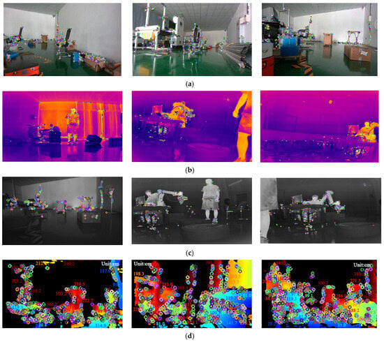 The feature extraction results in the VIO module using RGB, infrared, and depth images under different lighting conditions in a small-scale indoor simulated environment. (a) The extraction of environmental features from RGB frames during the day. (b) Feature extraction of environmental characteristics from infrared frames during the day. (c) Feature extraction of environmental characteristics from infrared frames during the night. (d) Feature coordinates with depth values in the depth image.