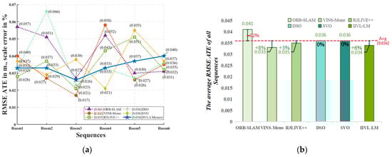 The RMSE provides a more precise statistical measure of errors, as shown in Equation (29). In this equation, Δ represents the time interval, n denotes the total number of frames, and corresponds to the translational component of the relative pose error.