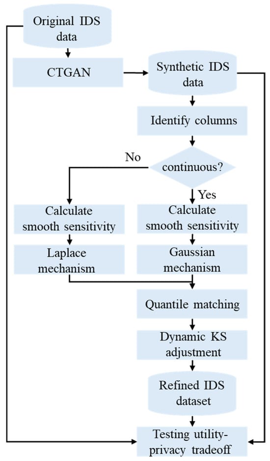 To further enhance the utility of the noisy data, dynamic adjustments were made using the Kolmogorov–Smirnov (KS) test, which measures the similarity between the distributions of real and synthetic datasets. First, the noisy and real data values were partitioned into bins, and the KS test was performed on these binned values. This step provided a statistic that quantified the dissimilarity distribution between datasets. Based on the output of the KS test statistics and the variance of the original data, the adjustment threshold was dynamically set. If the KS test statistics exceeded the threshold, the noisy data were modified by clipping values to be within the appropriate bin edges to better match the histogram of the original data. To avoid overfitting and privacy leakage, a slight noise was added probabilistically to maintain the DP while smoothing any sudden corrections during the process. Algorithm 1 describes the proposed utility-preserving DP methodology in detail.