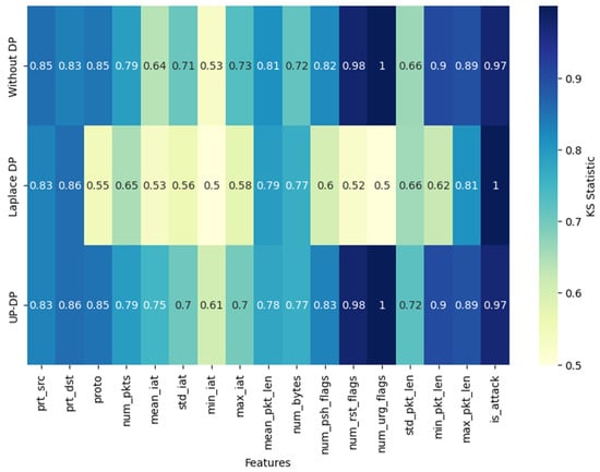 Figure 5 is a heatmap that compares the KS test score of each feature for the three settings: synthetic data without DP, with Laplace DP, and with UP-DP. It demonstrates that the KS clipping step in UP-DP can increase the KS test score of features such as std_pkt_len, min_iat, and num_bytes. However, a few features showed lower KS scores, which can be due to the last step of applying jittering to avoid overfitting and matching with the original data.