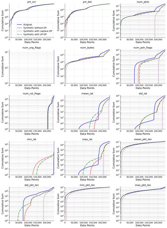 To visualize the results, the cumulative sums illustrate how well the proposed synthetic dataset with UP-DP fits with the original dataset and prove that it maintains the attack and normal packet’s features. The cumulative sum is a sequence of sums of given data; it is the sum of all the index’s elements. Researchers use it as a testing tool to obtain a visual understanding of the synthetic datasets and how they are affected by the experimental settings [33,44,45]. Figure 6 shows a detailed comparison between the original data and the three synthetic data types, without DP, with Laplace DP, and UP-DP. The Laplace DP was selected for comparison as it showed the highest accuracy across the common DP mechanisms. The cumulative sums of each feature clearly demonstrate that the synthetic data with the UP-DP method was closer to the original dataset and maintains its characteristics, unlike the synthetic data with Laplace DP, which showed a significant difference in shape from the original data in most features. The synthetic data without any DP was the closest fit to the original data compared to the rest of the synthetic data.