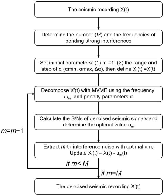 - Extract the m-th interference noise from seismic data using MVME with the optimal penalty parameter αm. Define the m-th interference as um(t) (um(t) = [um,1(t), … um,c(t), …, um,C(t)]; c represents the channel. The residual signal after removing m-th interference can be obtained by X’(t) = X(t) − um(t);