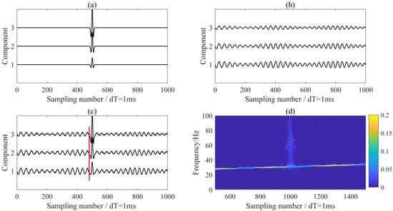 Waveforms of (a) the 3-C seismic signal, (b) the 3-C interference noise, and (c) the synthetic data. (d) The time-frequency analysis result of the 1st component data. The red lines in (c) indicate the seismic arrival.