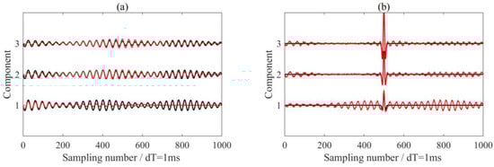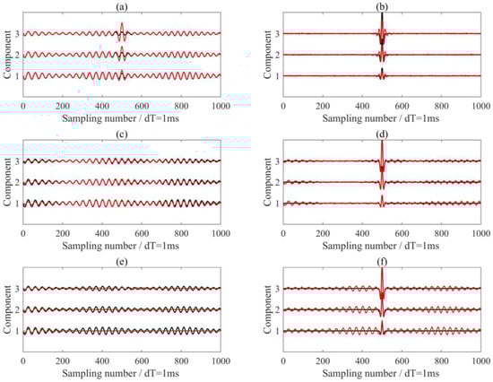 We also processed each of the three components using the VME method with identical parameters and the optimal α value. The processing results are presented in Figure 6a,b. Unlike the extraction results of components 2 and 3, signal component 1 showed a significant discrepancy compared to the actual signal, leading the underprocessing for the seismic wavelet signal. This discrepancy arose from variations in the energy distribution of the signal, influenced by differences in optimization outcomes. A comparison with the results shown in Figure 4c,d indicates that the MVME method was more effective at achieving synchronous analysis of multitrace data than the VME method.