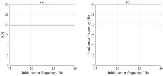 In addition, we compared the effect of different initial center frequencies on the extraction results by fixing α = 124,000. With ωd ranging from 15 to 30 Hz, we calculated and compared the S/Ns of the de-noised signals and the final center frequency after iteration. As long as the ωd value is estimated within an appropriate range, MVME exhibits consistent performance for interference extraction. The results, shown in Figure 5, indicate that the initial center frequency had a negligible effect on the results. In practice, the time-frequency-based method can help identify the range of ωd, allowing for easy determination of an acceptable or optimal value of ωd.