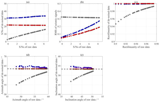 Comparison of the processing results of notch filter (grey dots), SST method (blue dots), and the proposed method (red dots). (a) S/Ns; (b) RMS; (c) rectilinearity; (d) azimuth angle; and (e) inclination angle.