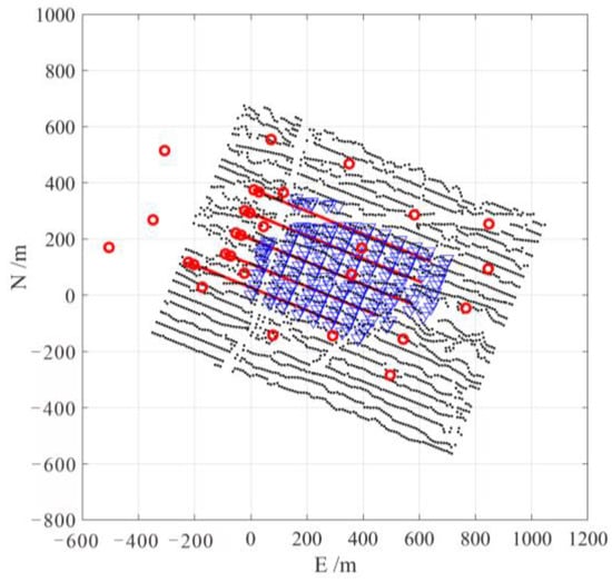 The planar view of the active seismic survey geometry. Black dots, blue triangles, and red circles represent the location of active seismic shots, 3-C receivers, and wellheads, respectively. The red lines indicate the horizontal well trajectories.