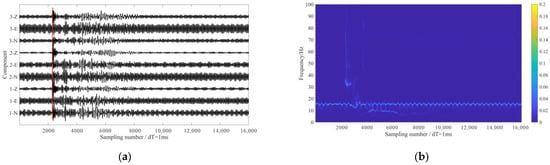 The 3-C seismic data from a SAGD seismic monitoring project. (a) The 3-C waveforms of an active shot. (b) The time-frequency analysis result of 1-N component data. The red lines in (a) indicate the manually picked direct P-wave arrival times.